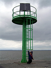 Prawy, zielony znak nawigacyjny wejścia do portu i zwieszający się z niego Bartek :) Gdzieś tam daleko - ale mniej więcej na wprost, już na Mierzei Wiślanej mamy Krynicę Morską. |