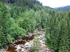 | Widok z mostu na północ - na górny bieg Izery. Mniej więcej od tego miejsca rzeka staje się granicą pomiędzy Rzeczpospolitą Polską (las po prawej) i Republiką Czeską (las po lewej). |