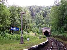| Kořenov zastávka jest jedynym przystankiem odcinka Tanvald - Kořenov wyposażonym w listwę zębatą systemu Abta - na pozostałych stacjach w ich obrębach "zębatka" jest wycięta. A zaraz za przystankiem zaczyna się najdłuższy tunel na całej linii z Tanvaldu do Jeleniej Góry - 940 m. Wzniesienie w nim przekracza 50 ‰, a sam tunel kończy się przed semaforem wjazdowym (nieczynnym) stacji w Kořenovie. Jest to jednocześnie najdłuższy jednotorowy tunel kolejowy w Republice Czeskiej. |