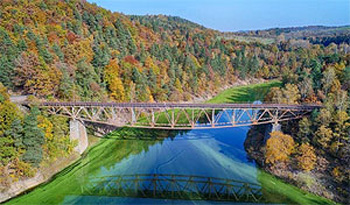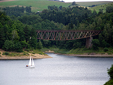 Most kolejowy nad Jeziorem Pilchowickim widziany z zapory. Obiekt po przeszło 100 latach istnienia stał się charakterystycznym elementem krajobrazu tej części Sudetów. |