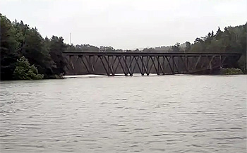 | Główne, paraboliczne przęsło mostu kolejowego nad Jeziorem Pilchowickim (a właściwie nad jego boczną, wschodnią odnogą) wspiera się na dwóch betonowo - kamiennych filarach oddalonych od siebie o 85 m. Jest to stalowa, nitowana konstrukcja kratowa z jazdą górą. Powstał w latach 1905 - 1906 w ramach budowy Kolei Doliny Bobru czyli połączenia kolejowego z Jeleniej Góry przez Lwówek Śląski i Zebrzydową do Żagania. |