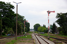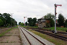 | Ujęcie w kierunku północno - zachodnim już spoza wielkiej rury. Mamy tu powtarzacze semaforów wyjazdowych (niestety - już świetlnych) L, K i J oraz wyjazd do Sierpca. Po lewej nieco odrapana (bo możliwe że przeznaczona do unieczynnienia) nastawnia wykonawcza "Pł". |