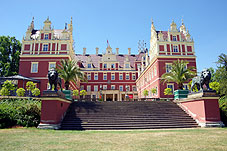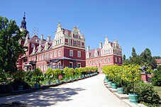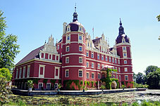 Niewątpliwie najważniejszym, najbardziej znanym obiektem Parku Mużakowskiego jest Nowy Zamek (Neue Schloss) którego ostateczna, neorenesansowa forma powstała w drugiej połowie XIX wieku według planów architektów Maksymiliana Franza Strassera i Hermanna Wentzela. Dostęp do dziedzińca od strony południowej. |