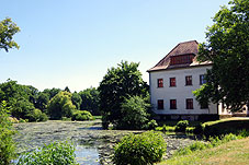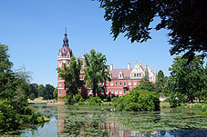 Widok na Nowy Zamek i jezioro Luciesee do strony południowej z Mostu Karpiego. Jeszcze w latach 80-tych była to ruina której władze NRD nie zamierzały ratować jako wrogiej klasowo. Sukcesywna renowacja obiektu zaczęła się dopiero 5 lat po zjednoczeniu Niemiec i została zakończona w roku 2011. Cały Park Mużakowski (a więc jego części polska i niemiecka) wraz ze wszystkimi obiektami architektonicznymi został wpisany na Listę Światowego Dziedzictwa UNESCO 2 lipca 2004 roku. |