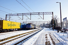 | Przechodzimy na "wrocławską" część dworca na peron 1. Daleko nie jest - przechodzimy telko przez trawkę przypruszoną śniegiem pomiędzy peronami. Ujęcie w kierunku zachodnim - wyjazd do Rzepina. Kilkaset metrów dalej, za łukiem w prawo znajduje się Zakład Napraw Taboru PKP Cargo. Po prawej zaparkował długi skład kontenerowy z chińszczyzną. |