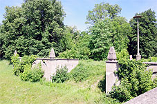 Co mamy tu dzisiaj ? Absurdalnie prostą, szeroką i wybrukowaną kostką aleję którą do Zasieków wjeżdżamy od strony Brodów, zdziczały ale skanalizowany las który przez kilkadziesiąt następnych lat porósł dawne place, ulice, podwórka i miejsca po rozebranych kamienicach, a tutaj - na wjeździe na ruiny Długiego Mostu dwie wysokie, betonowe, modernistyczne latarnie (takie same znajdują się przy zburzonej kładce dla pieszych położonej nieco bardziej na południe) oraz cokół Fontanny Tkacza. Schodami (miejsce po nich widoczne po lewej) można było zejść na promenadę prowadzącą wzdłuż brzegu rzeki. |
