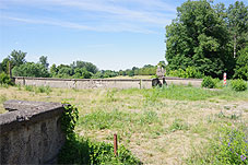 | Widok w kierunku zachodnim z przejazdu kolejowego - wyjazd do Forst. Dwa solidne, betonowe fundamenty po obu stronach torowiska to albo pamiątka po dawnym pomoście rewizyjnym WOP (ale nie będę się upierał) lub też pozostałość po bramce semaforowej. |