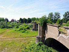 Prawy, polski brzeg Nysy Łużyckiej i przyczółek zburzonego pod koniec II wojny światowej Długiego Mostu (Lange Brücke) który przed wojną spinał dwie części miasta Forst. Most wybudowany według projektu Rudolfa Kühna został oddany do użytku w roku 1921, ale nie istniał długo. Wycofujące się wojska niemieckie wysadziły go zimą 1945 roku przed nacierającą Armią Czerwoną. |